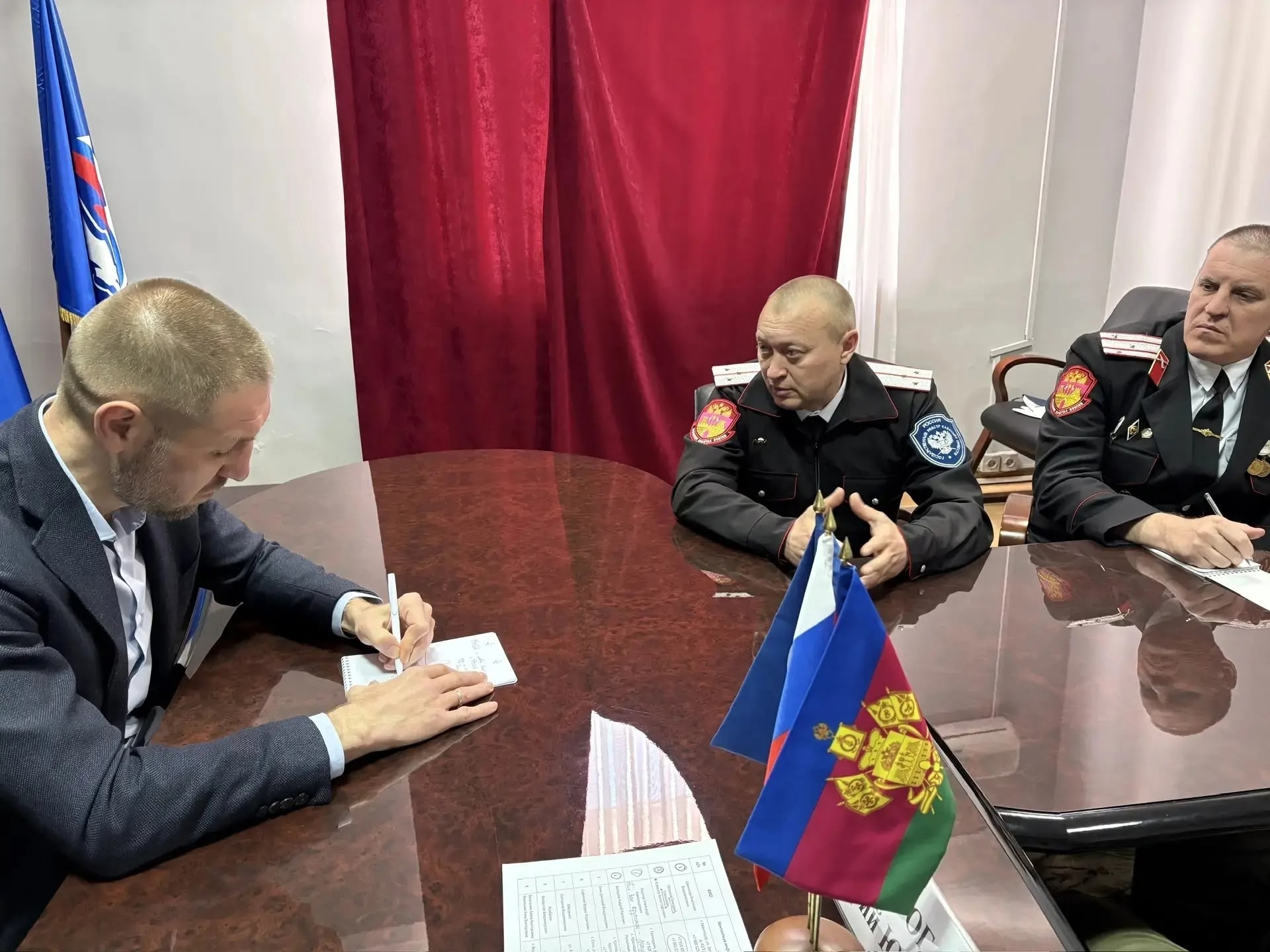 С атаманом Екатеринодарского районного казачьего общества Андреем Белоусовым обсудили возможности казачества в охране правопорядка краевой столицы и участие казаков в специальной военной операции. В обществе состоит свыше 1,7 тыс. казаков, несколько сотен из них принимают участие в СВО с учетом ротации, свыше ста несут государственную службу. Добровольные народные дружины совместно с сотрудниками полиции охраняют общественный порядок в Краснодаре, участвуют в рейдовых мероприятиях по противодействию незаконной миграции и профилактике безнадзорности.